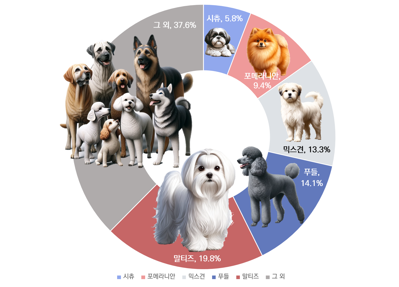 4위는 포메라니안(9.4%), 5위는 시츄 ( 5.8%), 그외(37.6%) 으로 나타났습니다.