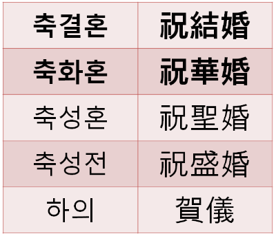 축화혼 (  華婚 ): 아름다운 결혼을 축하한다는 뜻(신부측에게만 쓰는 것 X)