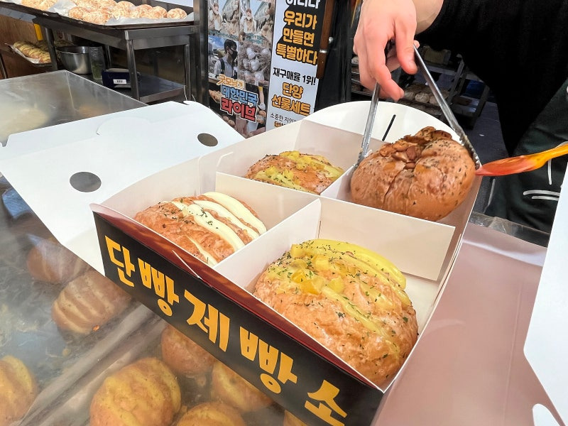 그 속에는 단양의 유명한 마늘빵이 들어있는데요, 단양 특산물인 마늘이 빵 속에 한가득 들어가있어 더욱 유명해졌답니다. 구경시장 내에서 만나볼 수 있는 '단빵제빵소'의 마늘빵은 바게트 마늘빵, 흑마늘 크림치즈, 스위트 포테이도 커스터드 마늘빵 등의 맛이 있으며, 겉바속촉 제대로 된 마늘 향을 느껴보실 수 있습니다.
