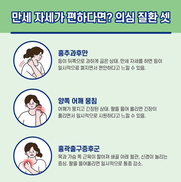 장시간 등이 너무 말려있는 경우 목과 가슴쪽 근육이 짧아지게 되는데요,