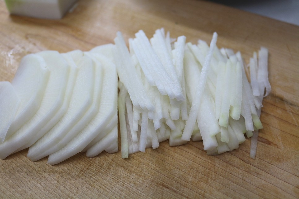 5.무는 채썰어주시고 홍고추도 쫑쫑 썰어 준비해주세요.