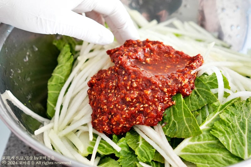 -재료: 봄동 1단(손질 후 250~280g정도), 무 80g, 다진 파 2스푼, 홍고추 1개