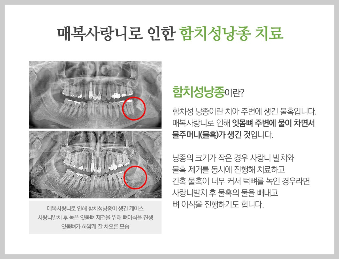대표적으로 매복된 사랑니 주변으로 물혹이 발생하는 '함치성 낭종'이 생길 수 있는데요,