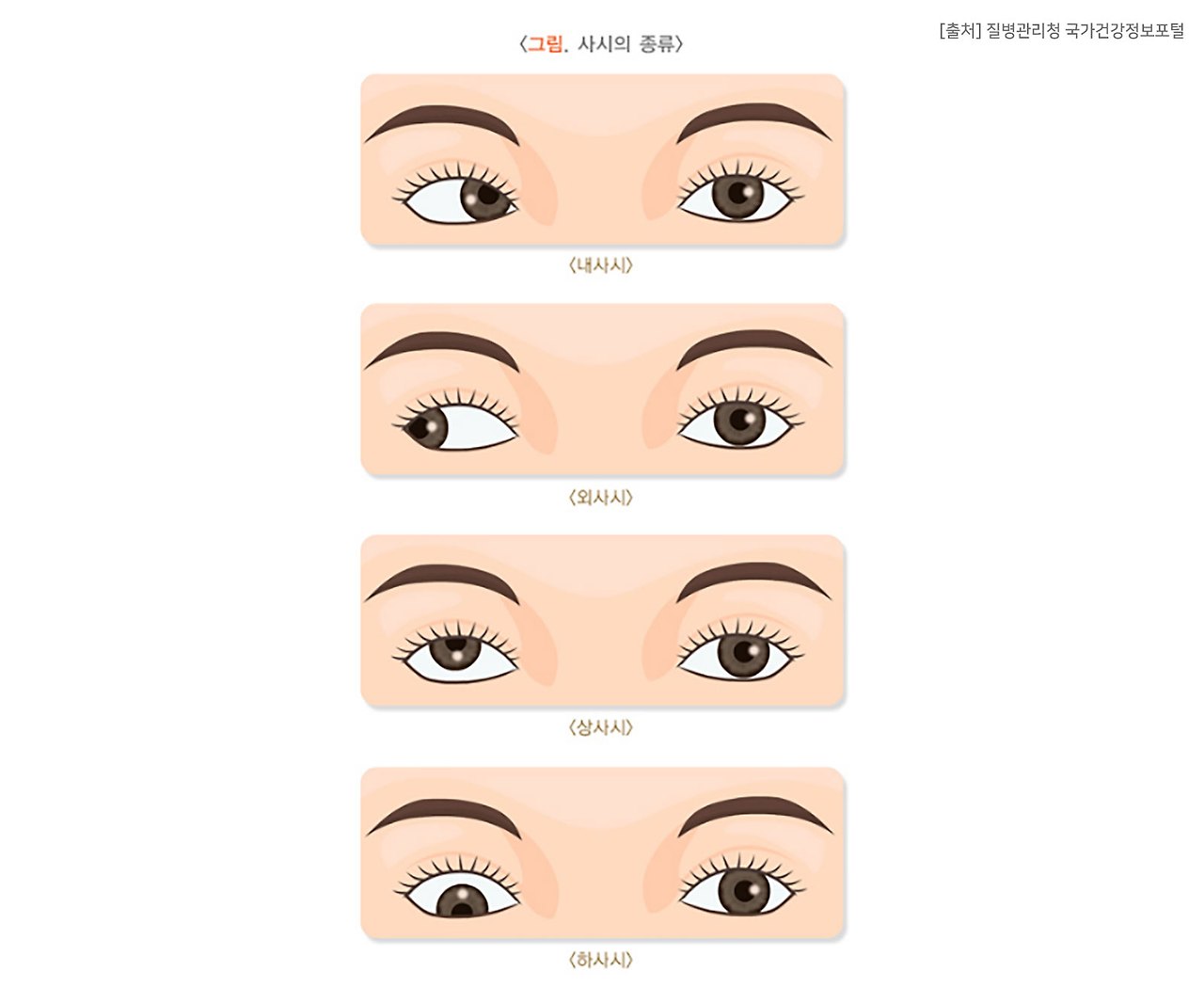 일반적으로 사람이 어떤 물체를 볼 때 정상적으로 두 개의 눈을 모두 사용하여 보게 되며, 정면을 볼 때 두 눈 모두 정면을 보기 때문에 두 눈의 검은 동자가 모두 눈 가운데 정렬되어 위치해야합니다.