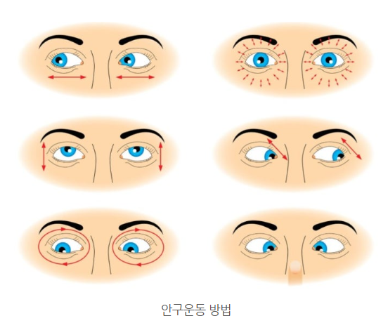 주기적으로 안구 운동을 실시해주시면 눈 피로를 줄이고 시력 개선에도 도움이 되며, 무엇보다도 사시 예방에 효과적입니다. 장시간 핸드폰이나 컴퓨터 화면만 바라보면 시력 저하 뿐 아니라 사시 위험도도 증가하기 떄문에 틈틈이 안구운동을 해주시는 것이 좋습니다. 안구 운동에는 눈 좌우상하로 움직이거나 눈동자로 숫자쓰기 등이 있습니다.