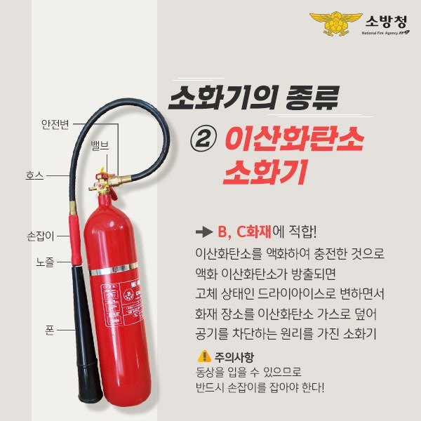 소화제로 이산화탄소(CO2)를 사용하며, 이산화탄소를 액화하여 충전한 소화기 입니다. 액화 이산화탄소가 방출되면 고체 상태인 드라이아이스로 변하면서 화재가 난 곳을 이산화탄소 가스로 덮어 공기를 차단하는 원리를 가진 소화기 입니다. 동상 위험이 있으므로 반드시 손잡이를 잡고 화재진압을 합니다.