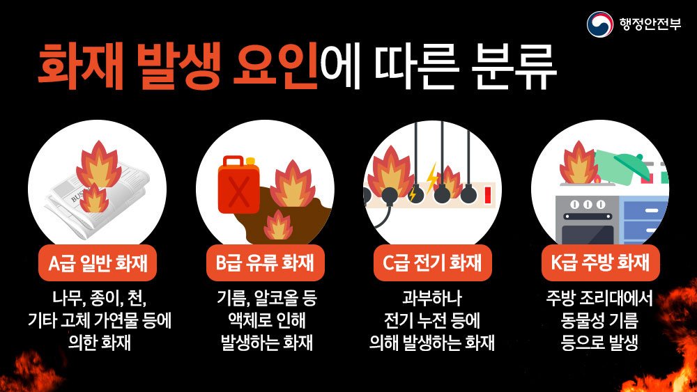 화재는 일반적으로 연소 특성에 따라 A,B,C,D급 4종류의 화재로 분류가 됩니다.