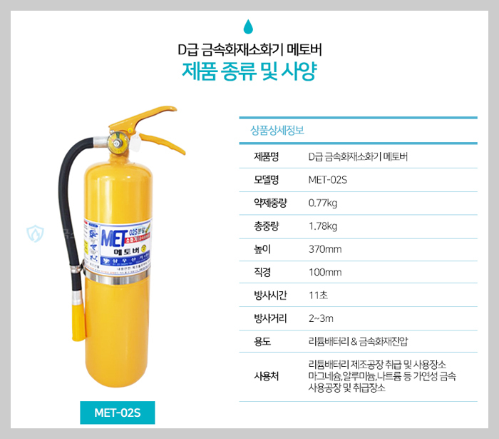 금속화재(D급 화재)에 적합하며, 팽창 질석, 건조한 모래, 금속 화재용 분말 등을 사용하여 불을 진압합니다. 일반적으로 노란색입니다.