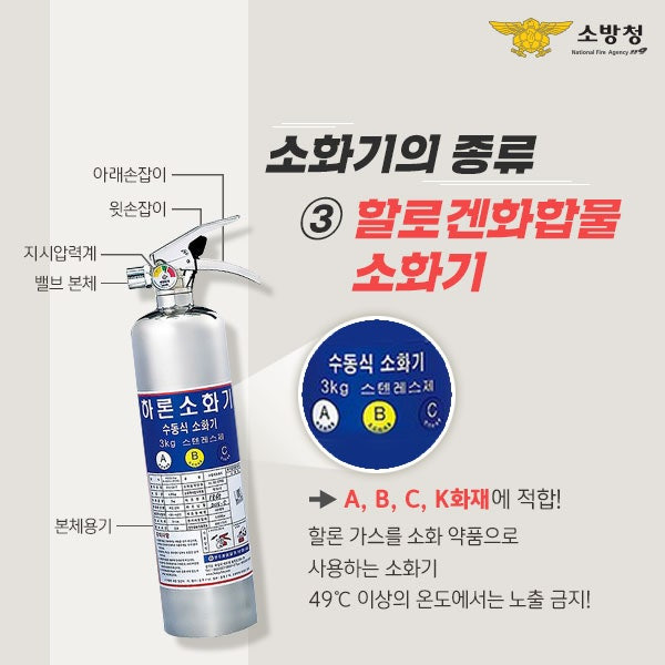 일반화재(A급 화재), 유류화재(B급 화재), 전기화재(C급 화재), 주방화재(K급 화재)에 적합합니다. A,B,C 분말 소화기 보다는 가격이 높지만 화재 진압 효과가 뛰어난 소화기로 장점이 많은 소화기 입니다. 할론 가스를 소화 약품으로 사용하며 49도 이상의 온도에서는 노출을 하시면 안됩니다.