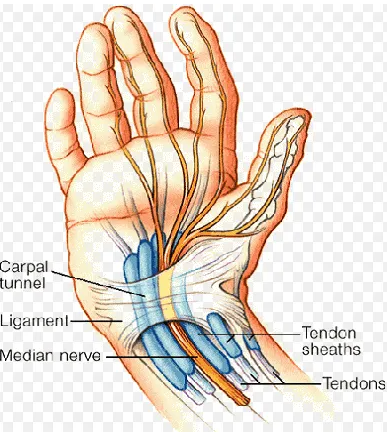 손가락을 움직이는 힘줄(손목 터널=수근관)에 신경이 눌려 압박을 받아,