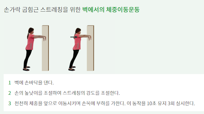 손목 꺾기, 공 쥐기, 털기, 깍지를 낀 채 앞으로 쭉 펴는 스트레칭을 많이 해주는 것이 좋습니다.