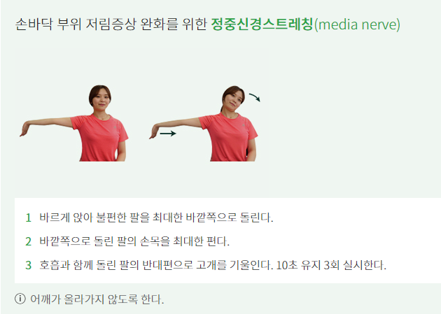 :손목을 과신전(뒤로 많이 젖히는 것)하거나 정중 신경에 지나친 압박을 가하는 자세는 피합니다,