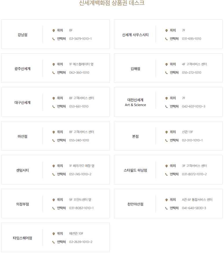 강남점 / 신세계 사우스시티 / 광주신세계 / 김해점 / 대구신세계 / 대전신세계 Art & Science / 마산점 / 본점 / 센텀시티 / 스타필드 하남점 / 의정부점 / 천안아산점 / 타임스퀘어점 / 스타일마켓 대전점