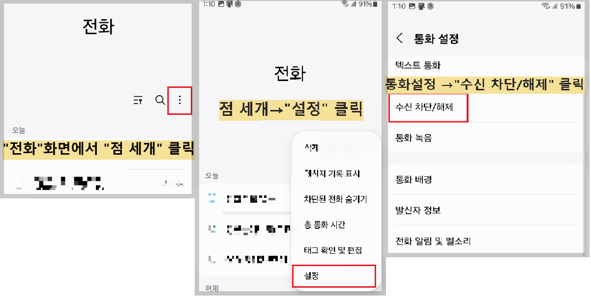 "전화" 앱을 열어 오른쪽 상단에서 점 세개를 눌러주세요. "설정" 메뉴 선택하시고 '수신 차단/해제'로 들어간 후