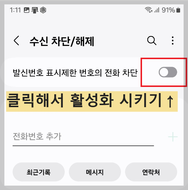 1. 방법- 전화 > 오른쪽 위 점 세개 > 수신 차단/해제 > "발신번호표시제한 차단 기능" 활성화