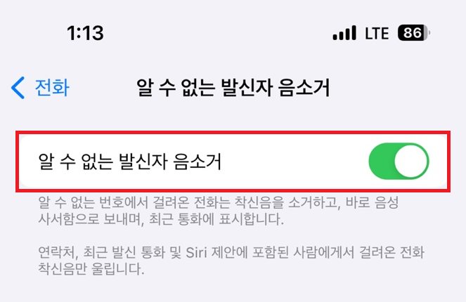 가장 간편한 방법은 아이폰 자체의 "알 수 없는 발신자 음소거" 기능을 사용하는 것입니다.