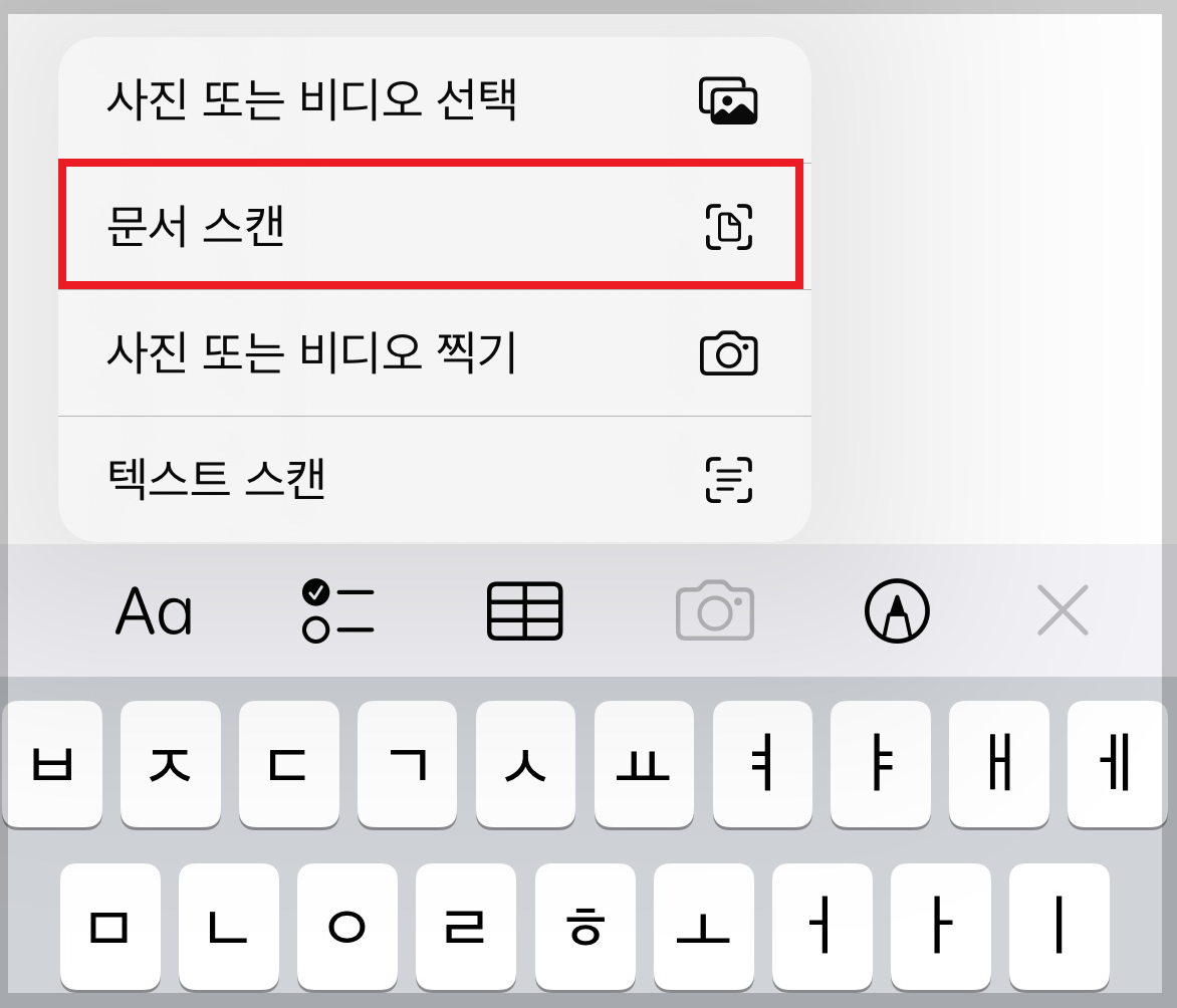 따로 문서 스캔 앱을 설치하지 않아도 아이폰에 기본적으로 설치되어있는 "메모" 앱으로 문서 스캔이 가능합니다.