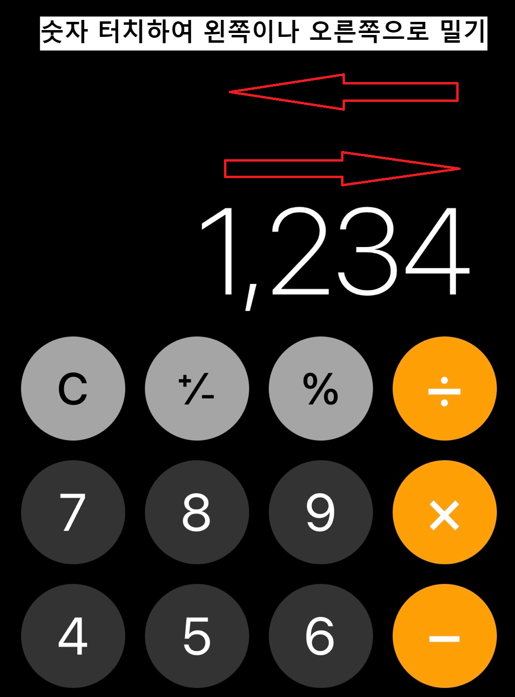 계산기 숫자 오른쪽/왼쪽으로 밀면 숫자 삭제 가능