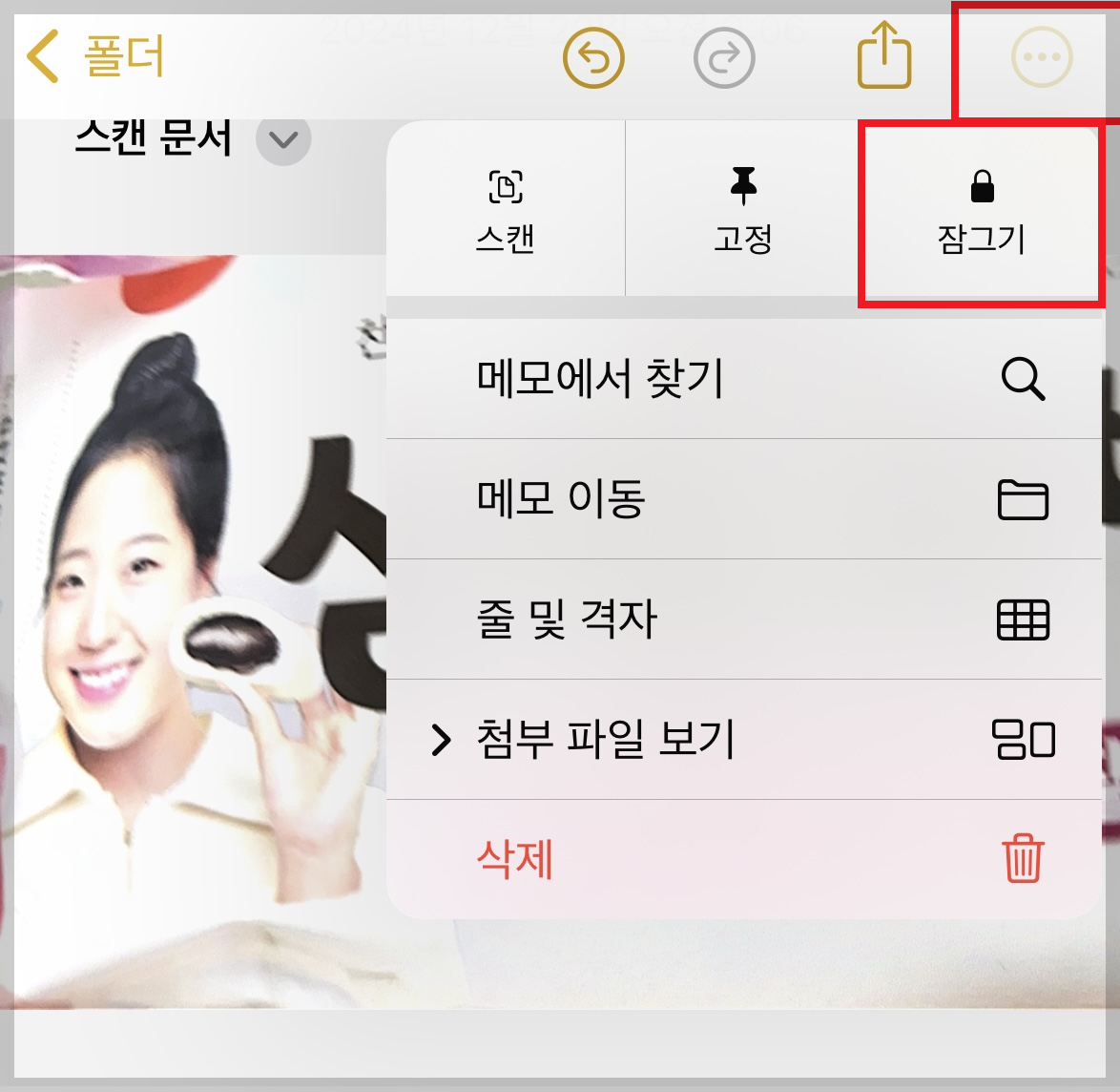 기본앱 "메모" 개별 잠금 가능(상단 점 세개 클릭, 잠그기)