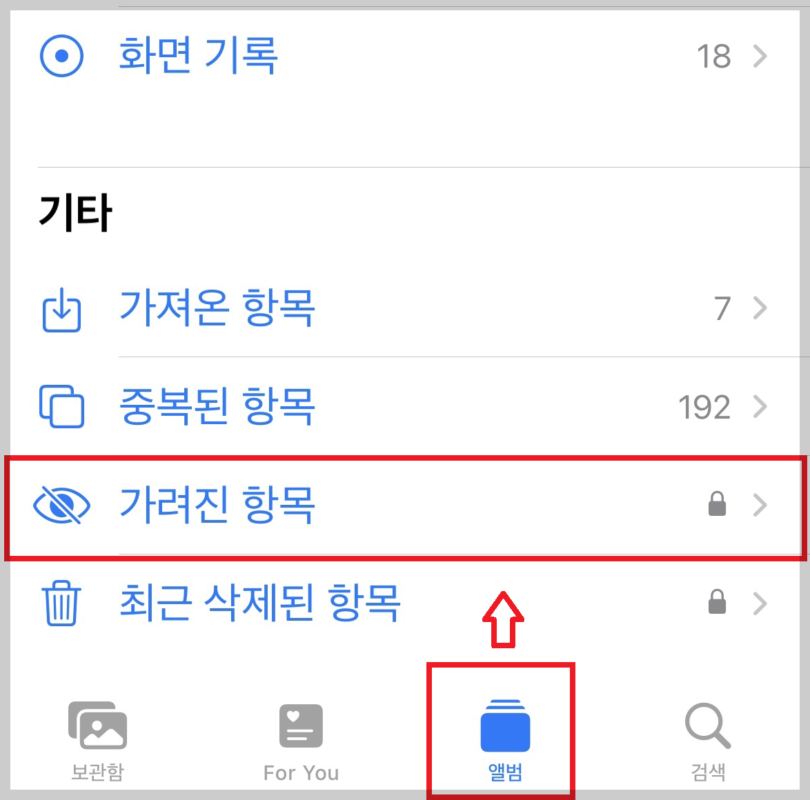 3) 숨긴 사진은 사진 앱의 "가려진 항목" 폴더에서 비밀번호 입력/생체 비밀번호 입력시에만 확인하실 수 있습니다.