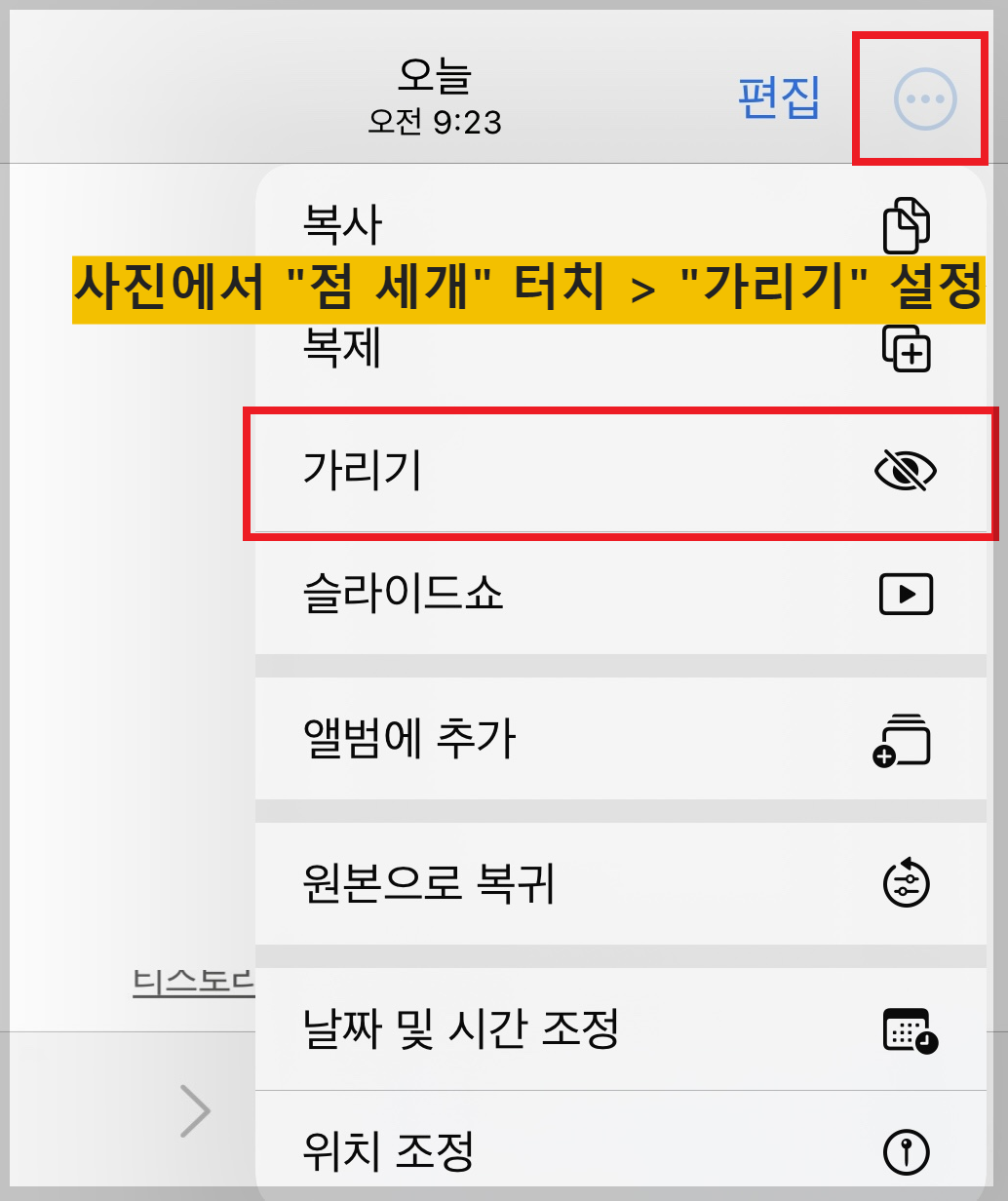 2) 하단 공유버튼을 누른 후 "가리기"를 눌러주세요.