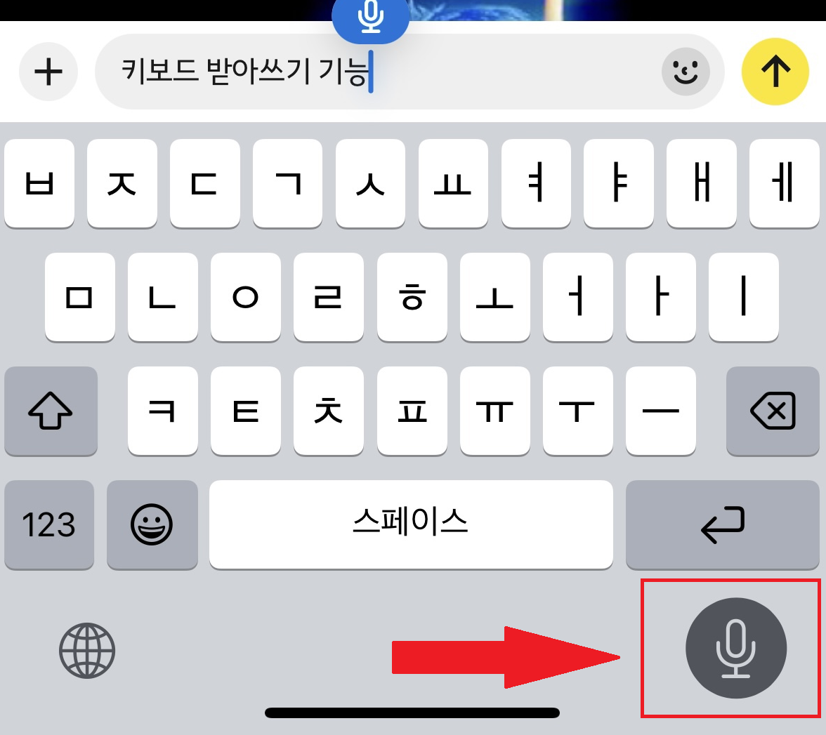 오른쪽 하단의 마이크 버튼을 누르고 말을 하시면 핸드폰이 목소리를 인식하여 텍스트를 입력합니다.