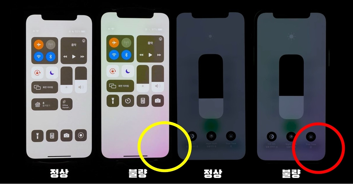 벚꽃 현상 테스트는, 화면 밝기를 손으로 터치하여 천천히 아래로 내려 밝기를 줄이면서 화면에 핑크색 색상이 생기는 부분이 있는지 체크하는 것입니다. 녹조 현상은 야간 모두에서 밝기를 최대로 올린 후 화면을 보았을 때 화면이 녹색을 띠지는 않는지 체크하시면 됩니다. 오줌현상은 'True tone'을 꺼조 화면이 노랗게 보이는지 확인하는 것입니다.