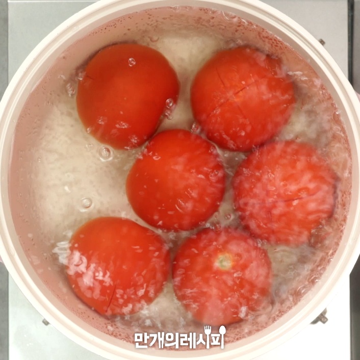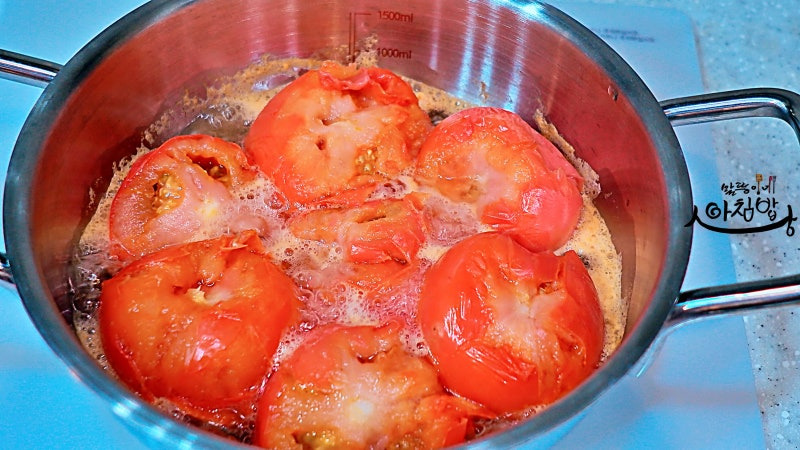 (5) 토마토 꼭지 부분이 냄비 바닥으로 가게 하여 물이 끓으면 앞뒤로 뒤집어주세요.
