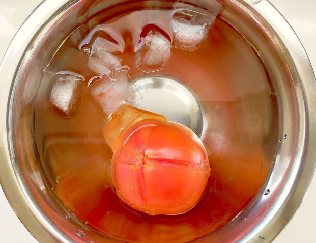 (7) 화상에 주의하며 토마토를 숟가락으로 조심스레 꺼낸 후 얼음물에 10초간 담가주세요.
