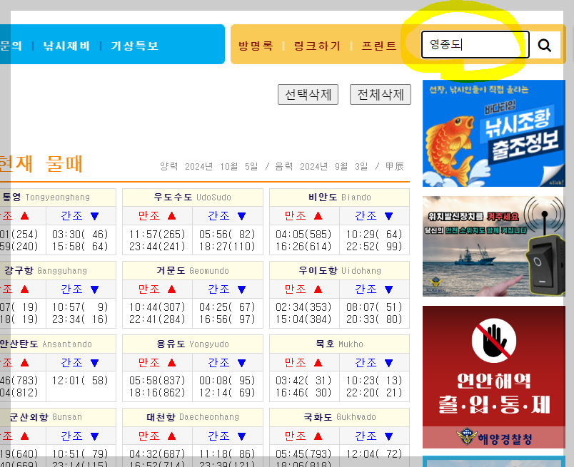 : 특정지역에서 일정 기간동안의 조수 간만의 시간이 언제인지 알려주는 표