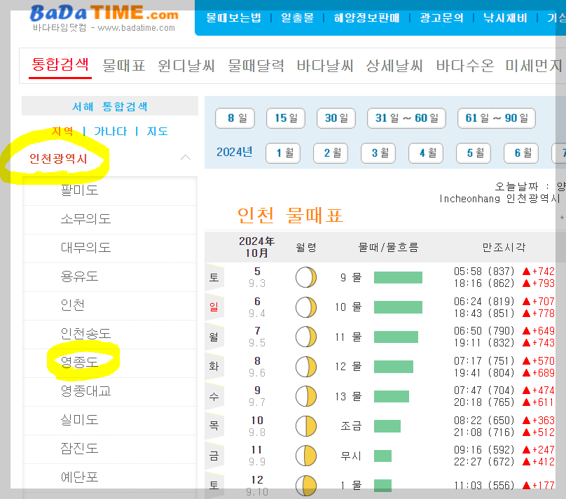 [바다타임]대한민국 최대 물때표 사이트>서해>인천>물때(상세내용)