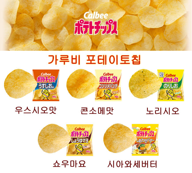 일본 감자칩 중 가장 인기가 좋은 과자 가루비 포테이토칩. 어떤 맛을 선택해도 실패가 없는 과자로 유명한데요, 일본인들에게도 굉장히 많은 사랑을 받는 감자칩이랍니다. 맛은 굉장히 다양하며 콘소메맛, 간장마요맛(쇼유마요), 연한 소금맛(우스시오), 김 소금맛(노리시오), 허니버터맛(시아와세버터) 등이 있어요. 오리지널은 연한 소금맛(우스시오)로 맥주와 함께 드시면 바삭바삭 궁합이 매우 좋답니다.