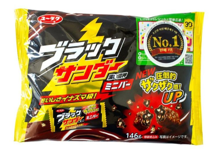 크런키의 씹는 맛이 너무나도 좋은 블랙 썬더! 코코아 쿠키와 비스킷을 초콜릿으로 코팅한 과자이며, 맛은 초코바와 비슷합니다. 가성비 대비 맛과 식감이 아주 훌륭하다고 평이 자자한 미니 초코바 입니다. 오리지널 맛이 인기가 좋아서 메론맛, 화이트 블랙선더 초콜릿(홋카이도 한정판)도 있는데요 화이트 초콜릿은 많이 단편이므로 단 것을 좋아하시는 분들에게 추천드립니다.