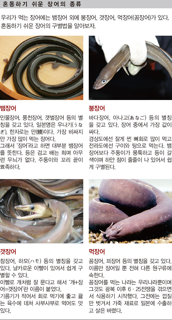 "장어 종류, 꼼장어/갯장어/붕장어/뱀장어 등"