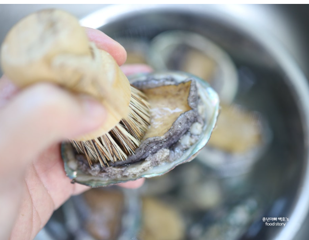 칫솔이나 작은 솔로 전복의 까만 부분을 구석구석 문질러 닦아주세요.