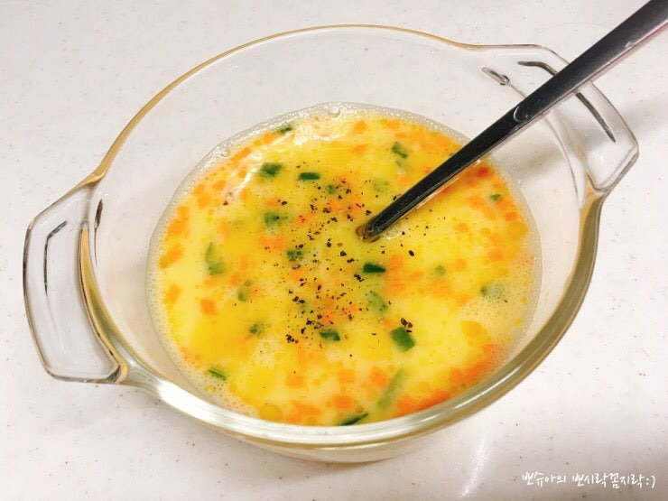 5. 계란을 모두 푼 후에 후추를 조금 톡톡 뿌린 후 그릇 위 랩을 잘 덮어주세요.