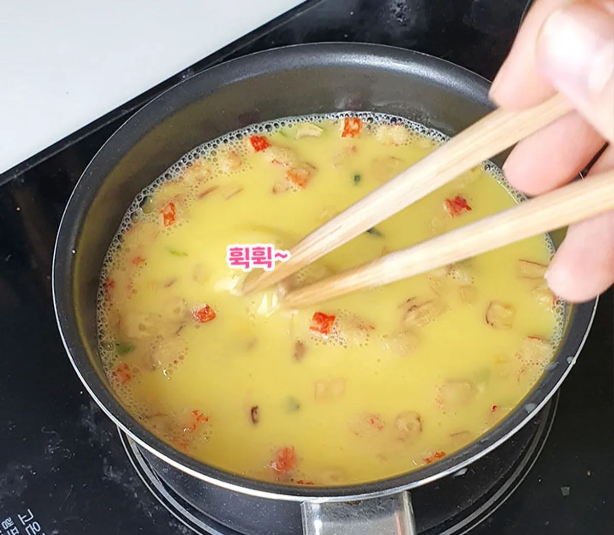 4. 그릇 속 재료들을 잘 섞어주시면 되는데요, 숟가락보다는 젓가락으로 빠르게 저어주시면 부드럽게 잘 섞인답니다.