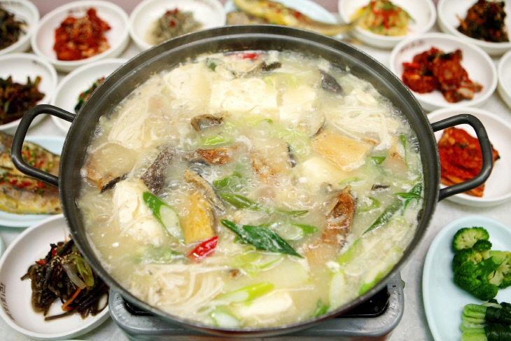 과거 태안에서 제사상에 올린 귀한 우럭 포를 두부와 채소 등을 넣고 새우젓으로 간을 하여 쌀뜨물에 뜨끈하게 끓여 먹던 음식입니다. 자극적이지 않으면서 구수하고 시원 칼칼한 국물은 속까지 뜨끈하게 데워주는데요, 주로 겨울에 많이 먹는 음식이랍니다.