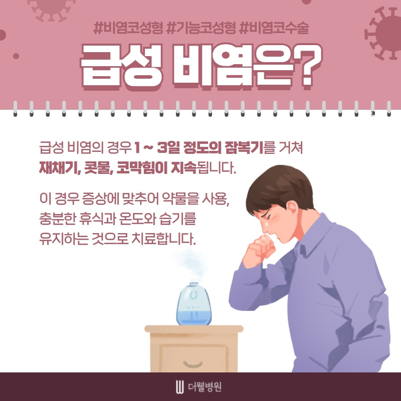 방치하면 만성 비염으로 번질 수 있으니 병원에 방문하여 휴식과 약물치료를 권해드립니다.