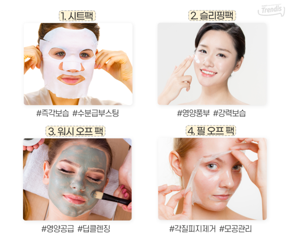 1) 본인 피부 타입과 현재 피부 상태에 따라 적절한 팩을 선택하여 사용합니다.