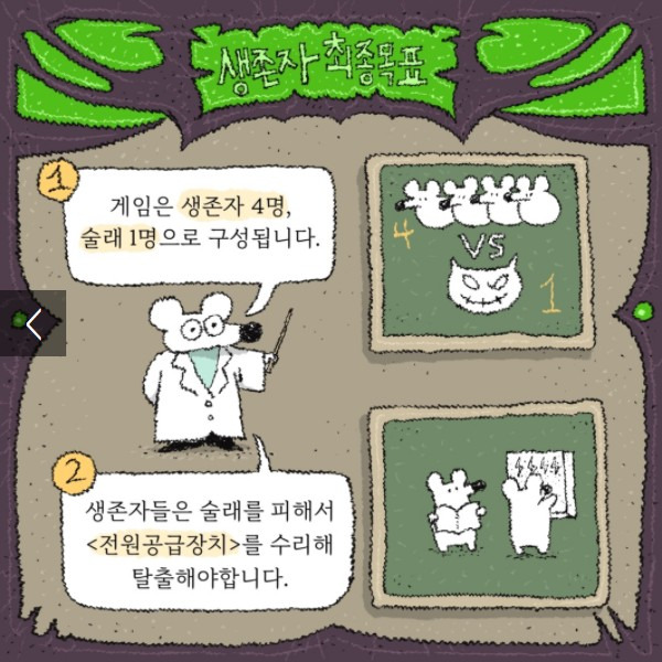 술래 1명과 생존자 3~5명이 테마 내에서 숨바꼭질을 하는 것입니다. 따라서 최소 인원이 4인 이상은 되어야 한답니다.