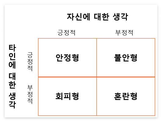 -안정형, 회피형(거부), 불안형(불안정/집착), 혼란형(공포)