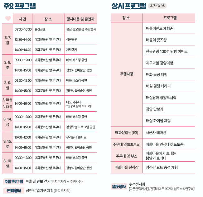 광양 매화축제 정보,광양 매화축제 위치/ 입장료/ 행사내용 프로그램/ 주차장
