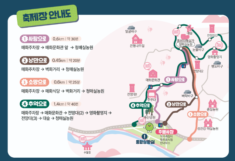 매 해마다 100만명이 넘는 관광객이 찾으며, 저렴한 입장료(상품권 환급, 사실상 무료)로 다양한 기획, 체험, 공연 행사들을 만나보실 수 있습니다. 아름답게 핀 매화 아래에서 매실 막걸리와 부추전을 맛보는 재미가 쏠쏠합답니다.